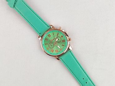 Damski zegarek analogowy w energetycznym, miętowo‑zielonym kolorze. Charakterystyka: - Mechanizm: kwarcowy (Quartz) - Tarcza: zielona, z promienistym szlifem; rzymskie indeksy i wskazówki w kolorz...