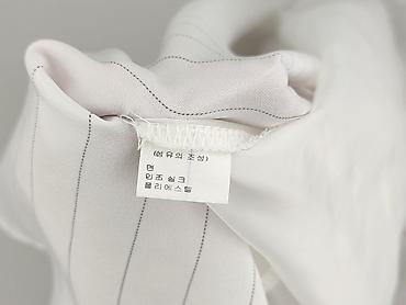 Bluzka damska bez rękawów w kolorze białym, SHAPIRA. - Delikatna, półprzezroczysta tkanina o drobnym, pionowym prążku. - Ozdobny, marszczony żabot z przodu, obszyty kontrastową czarną mereżką; dod...