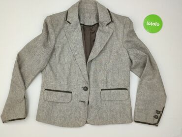 Szary damski żakiet Made in Italy - Klasyczny, taliowany krój z kołnierzem z klapami - Zapięcie na jeden guzik z przodu - Dwie przednie kieszenie z listewkami - Delikatnie melanżowa dzianina w odc...Stan:
