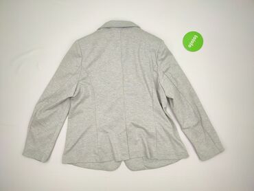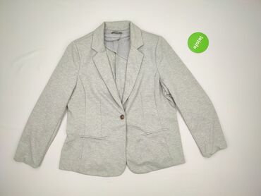 Szary żakiet damski - Krój: klasyczny, jednorzędowy z klapami, zapinany na 1 guzik - Kolor: jasny szary melanż - Materiał: 65% poliester, 35% bawełna – miękki, elastyczny dżersej - Rozmiar z metki...