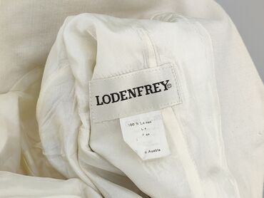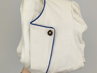 Biały żakiet damski z lnu - Materiał: 100% len (lekki, przewiewny, o wyraźnym, naturalnym splocie) - Krój: prosty, taliowany zaszewkami, bez zapięcia z przodu - Dekolt: otwarty z subtelnymi klapam...Stan: