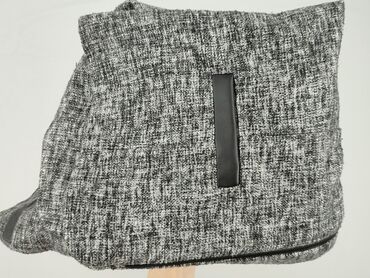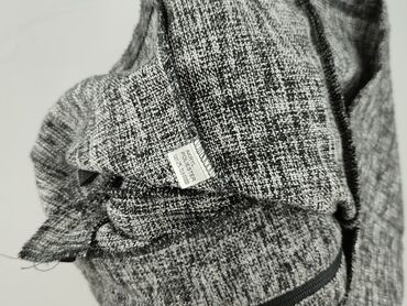 Szary żakiet damski bez kołnierza, zapinany na zamek. Tkanina o melanżowej, tweedowej fakturze w odcieniach szarości i czerni. Krój prosty, lekko wcięty w talii, długość do bioder. Długie rękawy. Z przodu dwie kieszenie z ozdobnymi, czarnymi lamówkami przypominającymi skórę; podobne wstawki przy wykończeniach. Rozmiar z metki: 46. Skład materiału: akryl i poliester (informacja z metki pielęgnacyjnej). Idealny do stylizacji smart casual i biurowych – świetnie łączy się z jeansami i spódnicami. Kolor i faktura dodają elegancji, a zamek błyskawiczny ułatwia szybkie zakładanie.