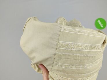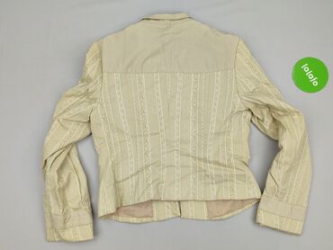 Beżowa damska marynarka/koszula z krótkim rękawem - Fason: dopasowany, z wydłużonym, szpiczastym dołem z przodu i tyłu - Zapięcie: 4 guziki z przodu - Kołnierz: klasyczny, z połyskującą satynową w...
