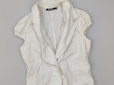 Elegancki, lekki lniany żakiet w odcieniu ecru, świetny do stylizacji biurowych i casualowych, do sukienek, spódnic i spodni. Marka MARGO. Rozmiar 36. 100% len. Zapięcie na 1 guzik, dwie kieszenie, krótkie rękawy z marszczeniem, taliowany fason, szlufki na pasek.