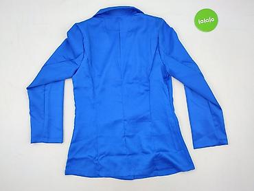 Żakiet damski w intensywnym kobalcie - Krój: elegancki, taliowany, bez zapięcia; przedłużony dół z zaokrąglonymi połami z przodu i z tyłu - Rękawy: 3/4 z szerokimi mankietami - Detale kroju: wyszc...Stan: