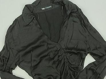 ZARA – krótka bluzka damska z długim rękawem - Kolor: czarny, satynowy połysk - Krój: krótki (crop), dopasowany w talii, dekolt V - Detale: drapowania i marszczenia z przodu, ozdobne metalowe pere...