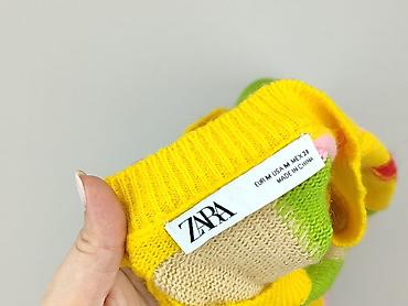 Sweter damski ZARA, rozmiar M. Krótki, luźny fason typu cropped z obniżoną linią ramion. Model w energetyczną kratę patchwork w kolorach: żółty, różowy, zielony, czerwony i beżowy. Okrągły dekolt, długie rękawy, elastyczne ściągacze przy kołnierzu, mankietach i u dołu.