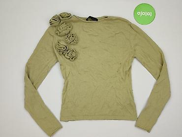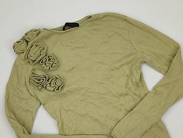 Sweter damski Zara, rozmiar S (EUR/USA S, MEX 26), kolor jasna oliwka/khaki. Model z długim rękawem i okrągłym dekoltem, ozdobiony trójwymiarowymi aplikacjami/kwiatami z dzianiny na lewym ramieniu i przy dekolcie – subtelny, efektowny akcent. Delikatna, cienka dzianina idealna na warstwowanie.