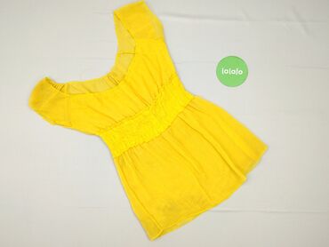 Żółta bluzka damska z krótkim rękawem - Krój: luźny, z lekkim wcięciem w talii i dekoracyjnym wiązaniem z przodu, dół lekko falowany/peplum - Dekolt: łódkowy - Rękawy: krótkie - Materiał: cienka, ...