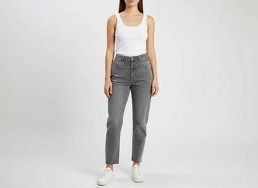 Damskie jeansy w szarym odcieniu, wykonane z mieszanki bawełny, poliestru i spandexu, co zapewnia wygodę i elastyczność. Spodnie posiadają klasyczny krój z pięcioma kieszeniami: dwoma z przodu, jed...