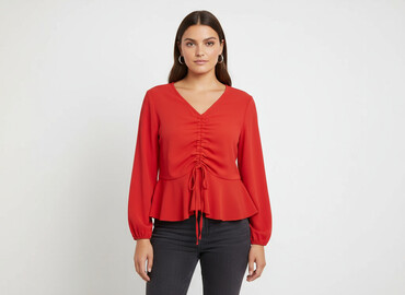 Przedmiotem ogłoszenia jest damska bluzka z długim rękawem w kolorze jasnobeżowym lub kremowym, wykonana z poliestru. Posiada klasyczny kołnierzyk i guzikowe zapięcie na całej długości. Marszczenia...