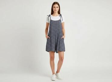 Kombinezon damski z ramiączkami i długimi nogawkami, idealny na cieplejsze dni. Wzór obejmuje geometryczne kształty w odcieniach bieli, różu i błękitu, rozmieszczone na granatowym tle. Delikatne ra...