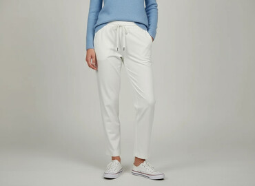 - Krój: luźniejsza góra z zaszewkami/przeszyciami, zwężane nogawki zakończone szerokim ściągaczem