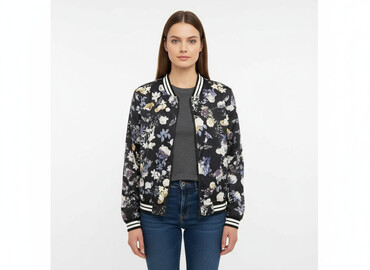 - Krój: lekka kurtka bomber/wiatrówka, długość do bioder