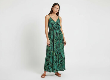 - Krój: taliowana góra z odcięciem w pasie i rozszerzaną, lekko marszczoną spódnicą