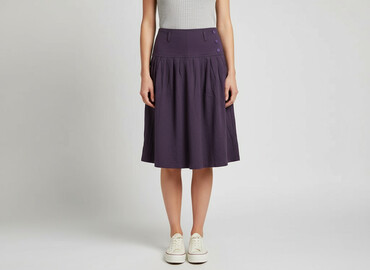 - Krój: rozkloszowana, z licznymi zakładkami poniżej szerokiego pasa; długość do kolan