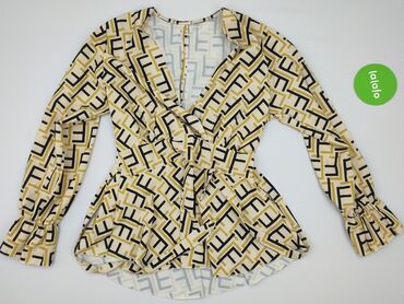 Bluzka damska IN FRONT - Rozmiar: M (z metki) - Materiał: 100% poliester - Kolor: musztardowy z białym, drobnym wzorem (print w stylu zygzaka/gałązek) - Krój: luźny, z marszczeniami - Dekolt: stój...