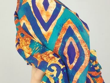 ПовсякденнеSukienka midi z włoskiej produkcji, wzór etniczno‑geometryczny w intensywnych kolorach: turkus, pomarańcz, granat, żółć i zieleń. Materiał: 100% poliester (metka “FABBRICATO IN ITALY”, ART 9793).