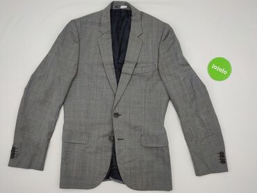 Marynarka męska Summer-cha - Krój: jednorzędowa, 3‑guzikowa - Klapy: klasyczne, otwarte - Materiał: 80% wełna, 20% poliester (na metce) - Podszewka: jasna, gładka - Wzór: szara tkanina w delikatne...